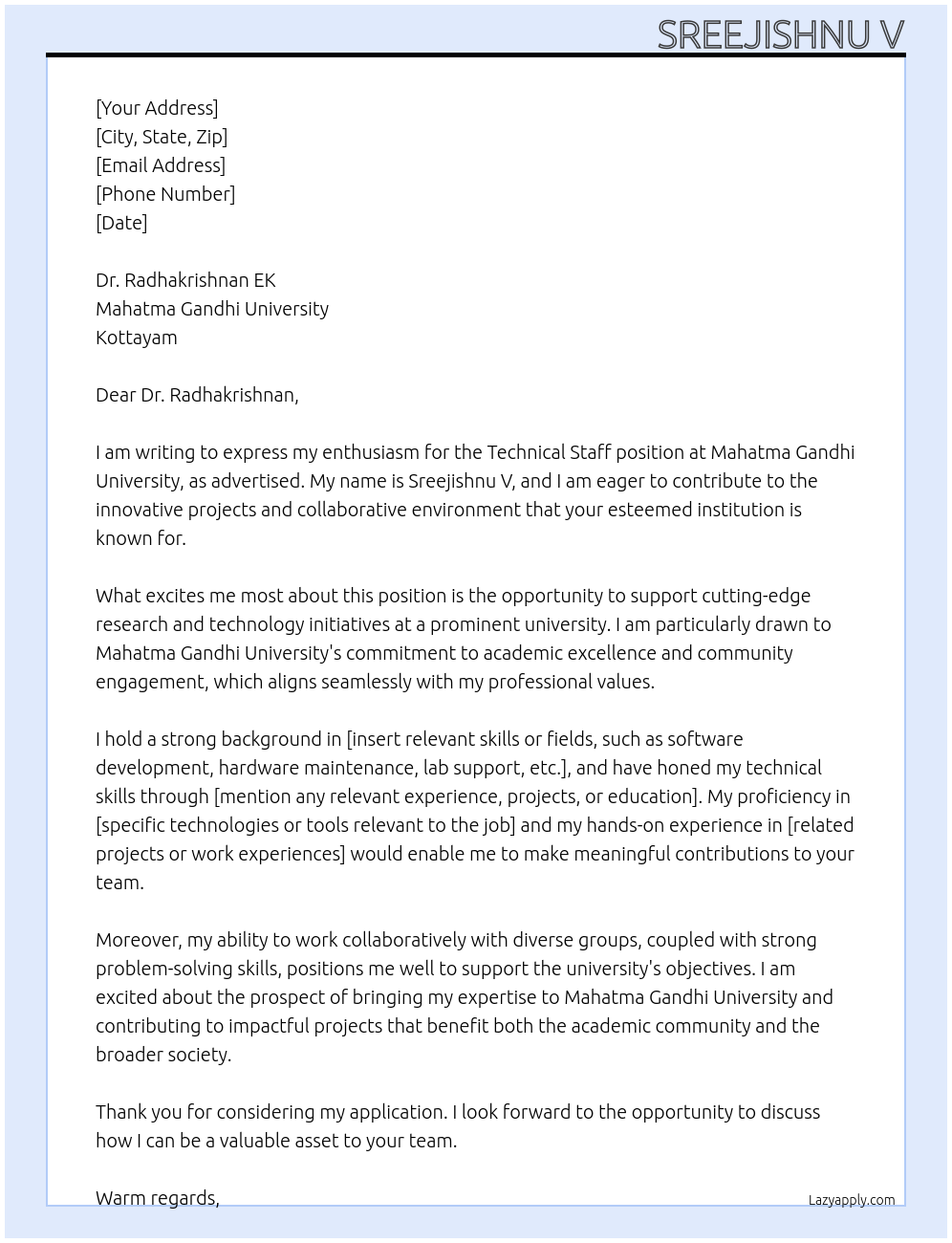 Technical Staff Cover Letter At Mahatma Gandhi University, Kottayam