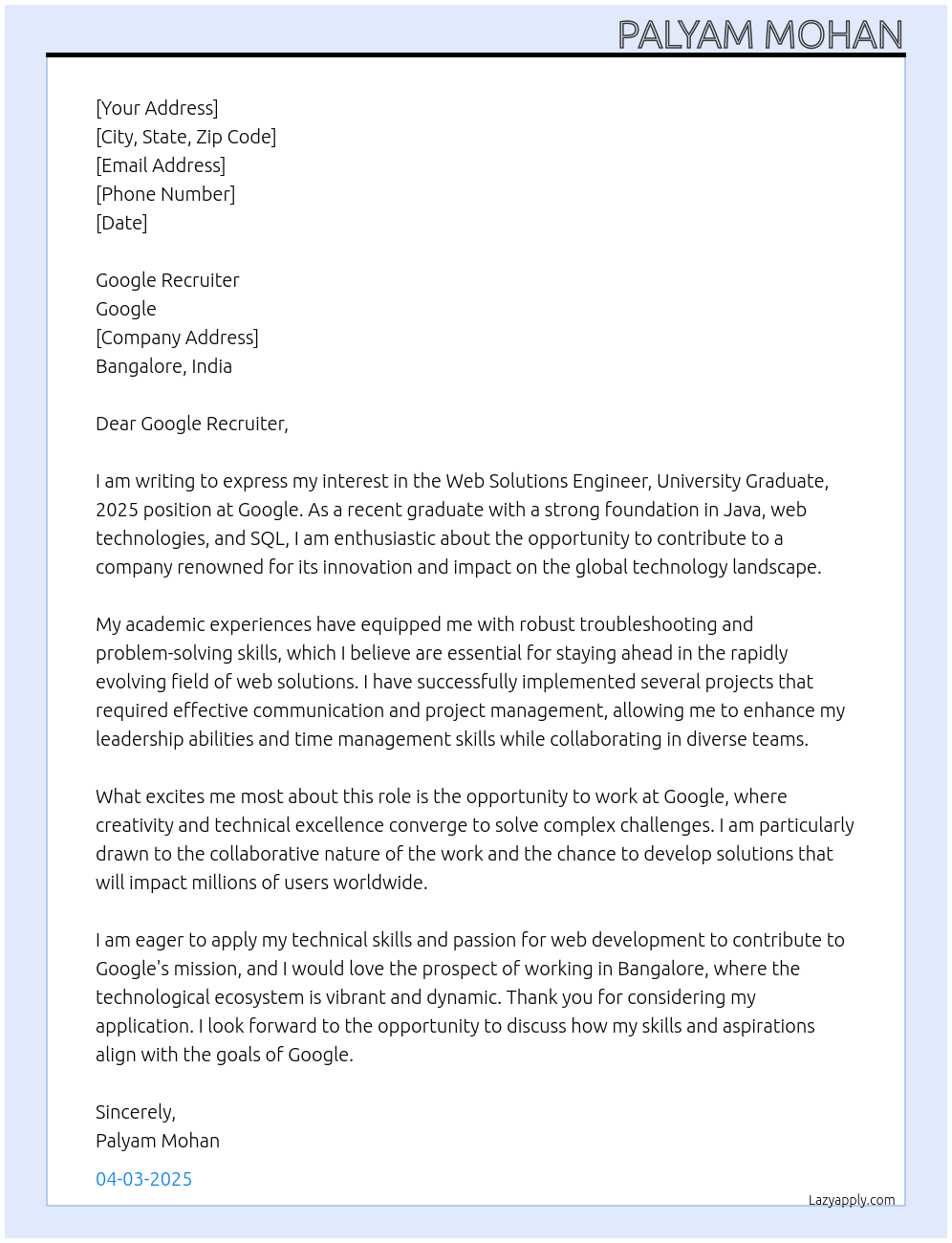 Web Solutions Engineer, University Graduate, 2025 Cover Letter At Google