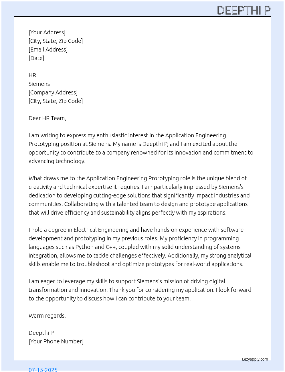 application engineering prototyping At Siemens Cover Letter