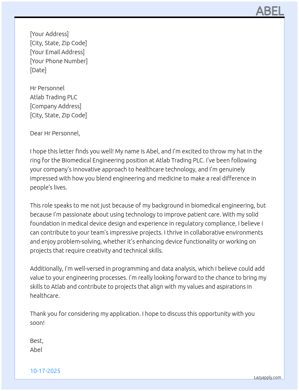 Biomedical engineering Cover Letter At Atlab trading plc