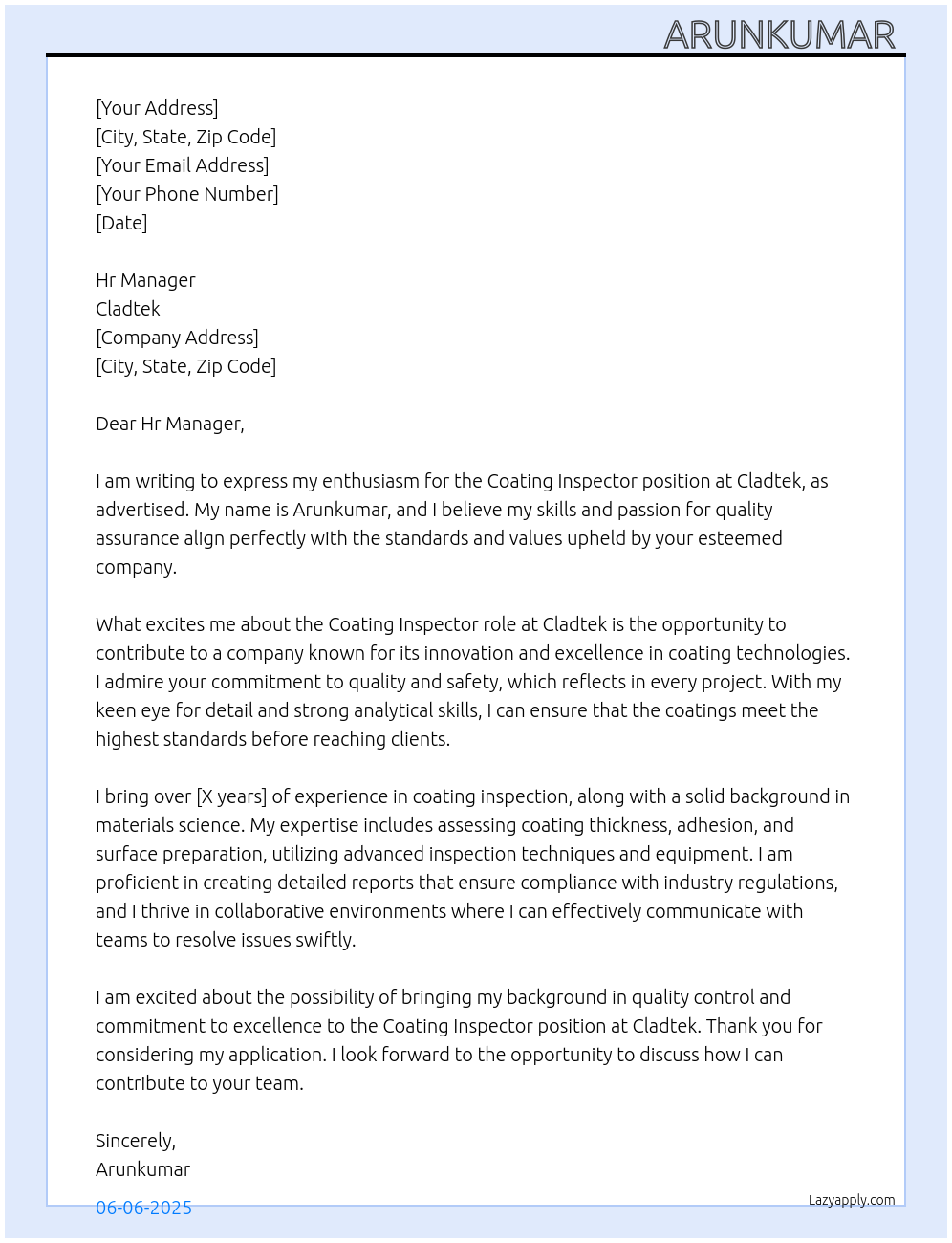 Check out these coating inspector cover letter sample and examples previously used by job seekers to land on job interviews as coating inspector. Use our AI cover letter generator to create a personalized cover letter as coating inspector.