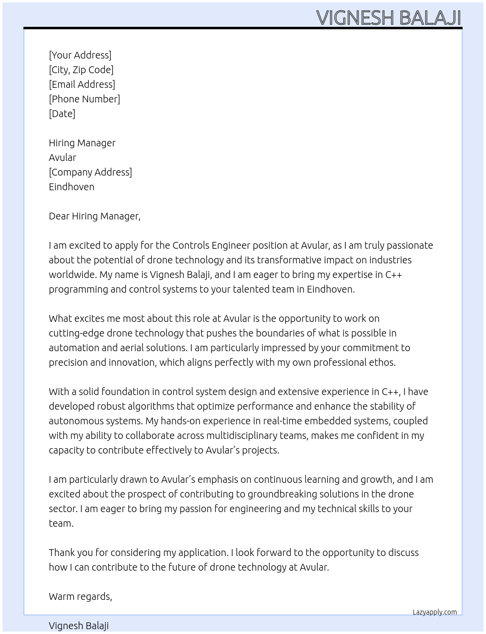 Check out these controls engineer cover letter sample and examples previously used by job seekers to land on job interviews as controls engineer. Use our AI cover letter generator to create a personalized cover letter as controls engineer.