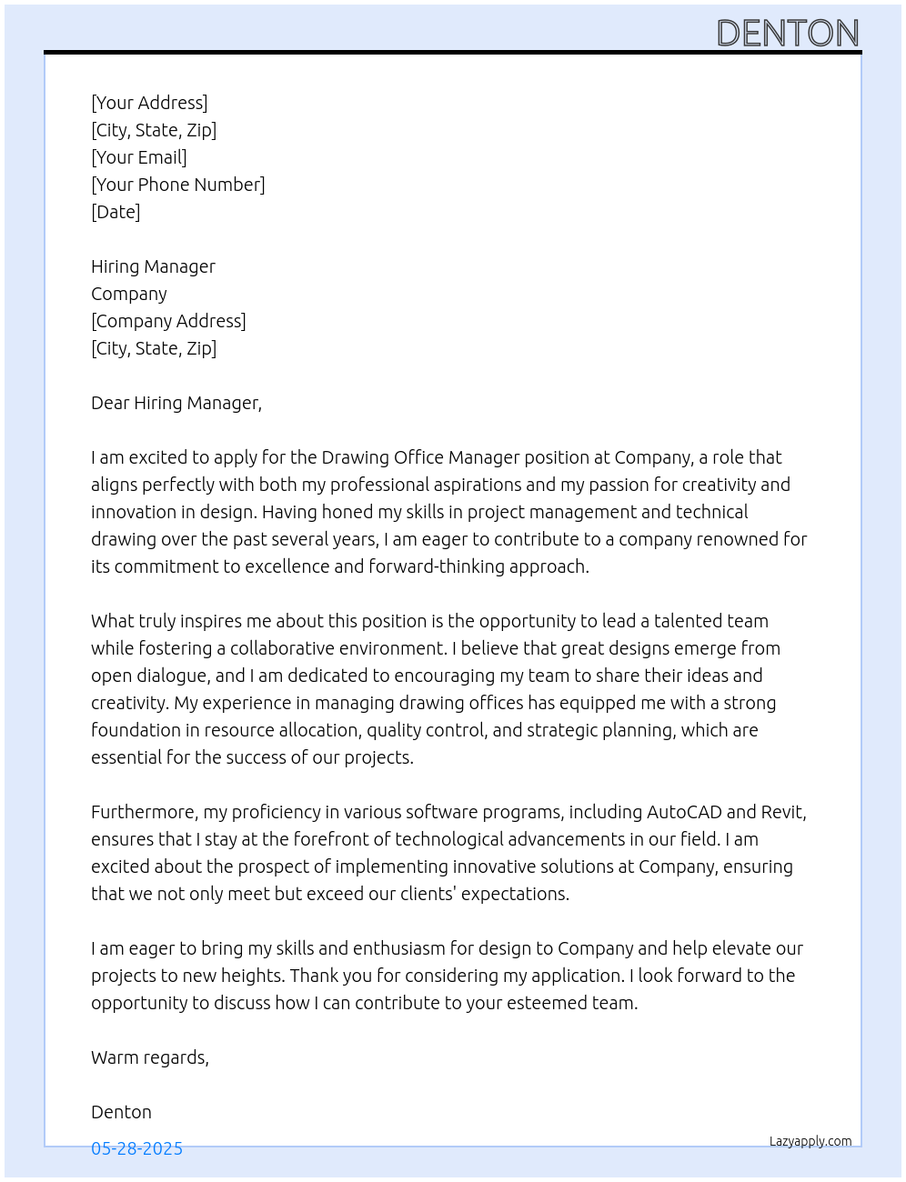 Check out these drawing office manager cover letter sample and examples previously used by job seekers to land on job interviews as drawing office manager. Use our AI cover letter generator to create a personalized cover letter as drawing office manager.