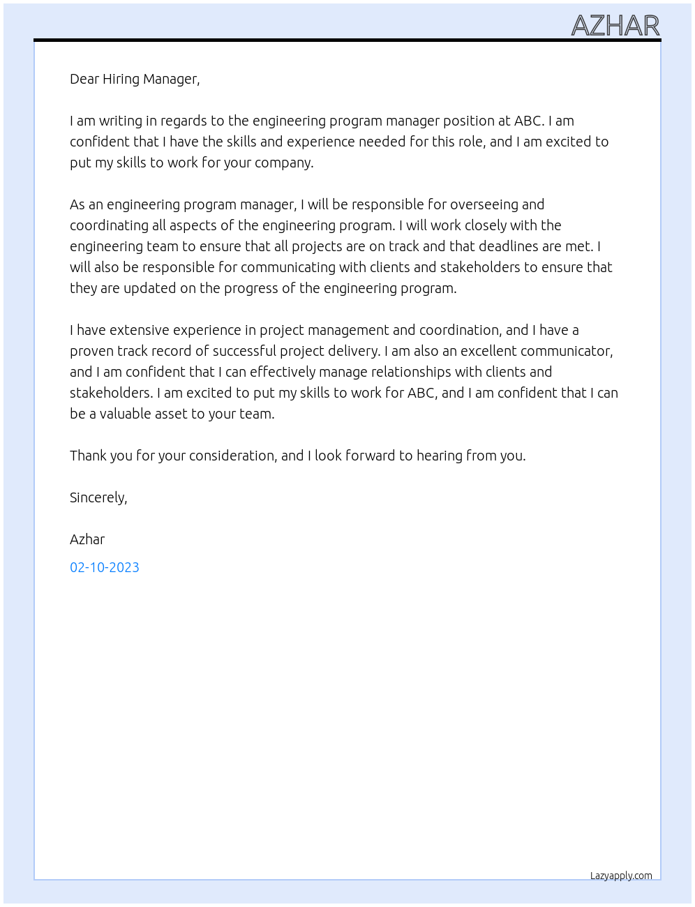 Check out these engineering program manager cover letter sample and examples previously used by job seekers to land on job interviews as engineering program manager. Use our AI cover letter generator to create a personalized cover letter as engineering program manager.