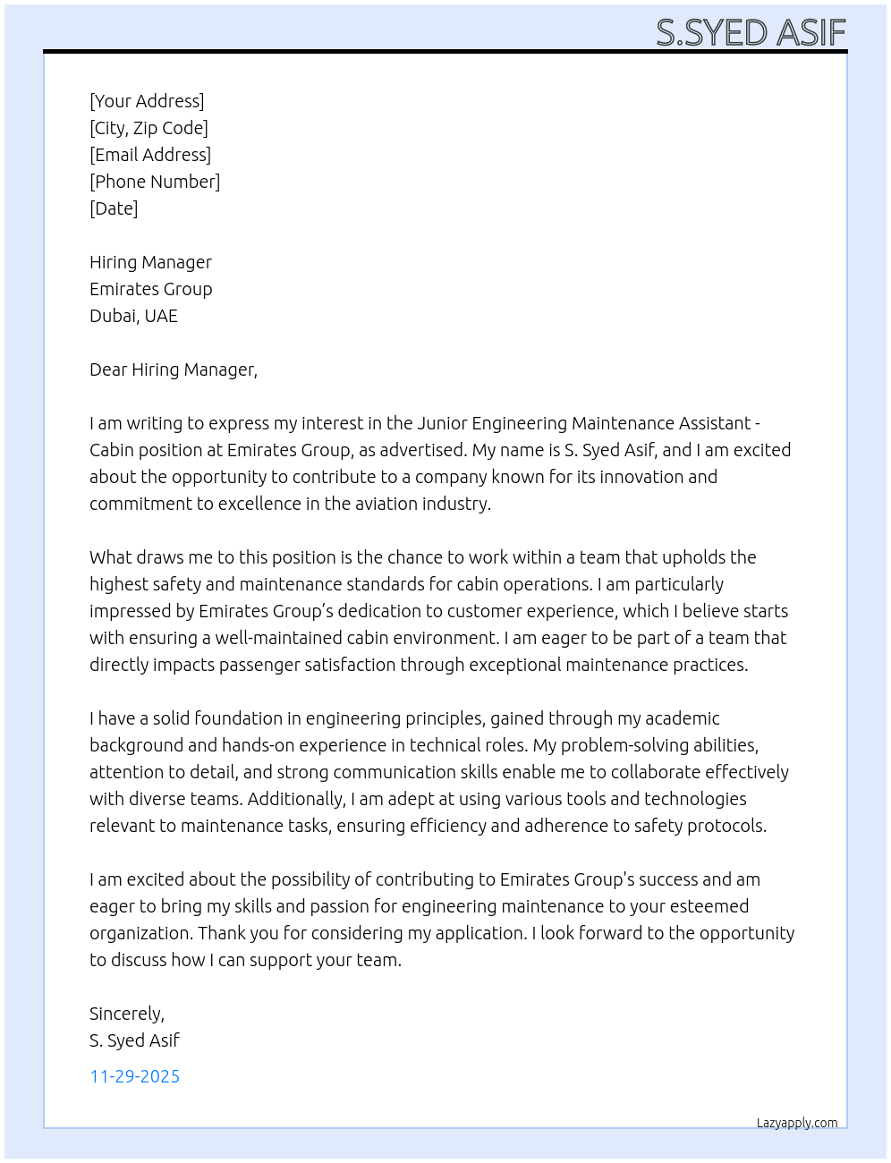 Junior Engineering Maintenance Assistant - Cabin Cover Letter At Emirates group