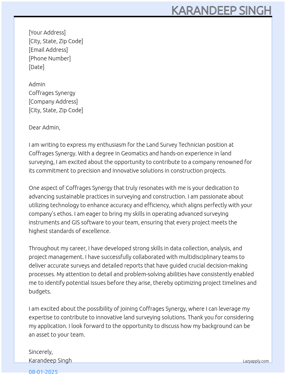 Check out these land survey technician cover letter sample and examples previously used by job seekers to land on job interviews as land survey technician. Use our AI cover letter generator to create a personalized cover letter as land survey technician.