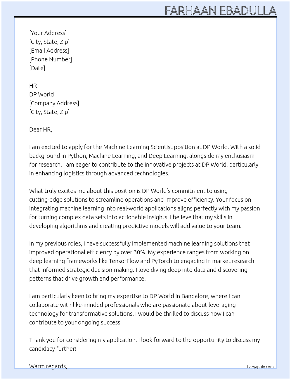 Machine Learning Scientist Cover Letter At DP WORLD