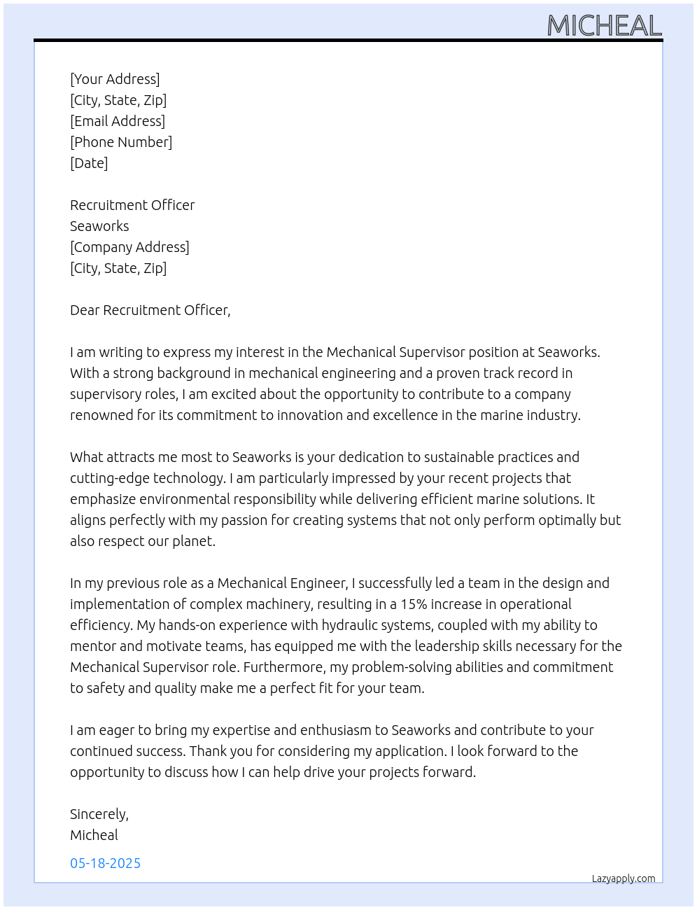 Check out these mechanical supervisor cover letter sample and examples previously used by job seekers to land on job interviews as mechanical supervisor. Use our AI cover letter generator to create a personalized cover letter as mechanical supervisor.