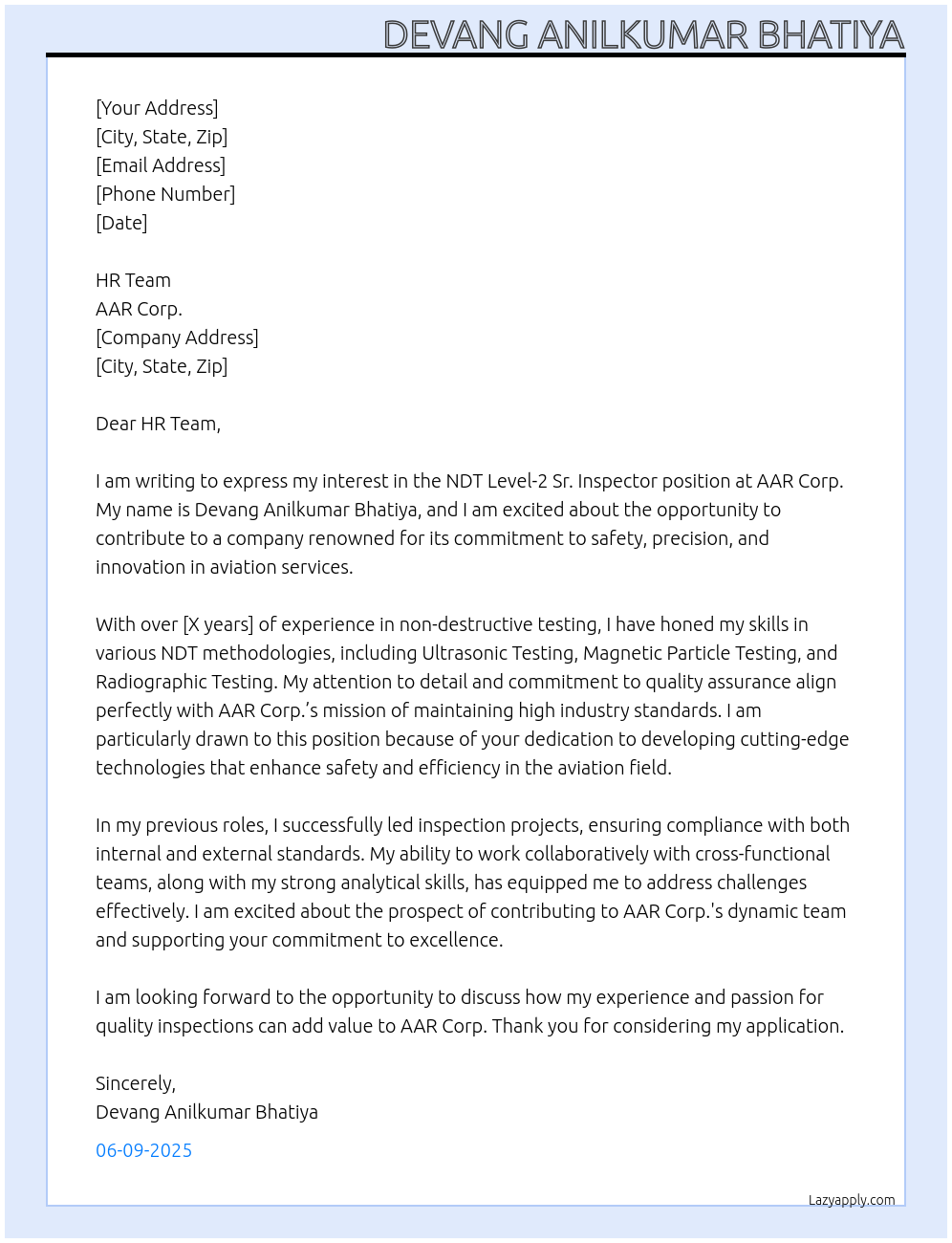 NDT level-2 Sr. inspector Cover Letter At AAR corp.