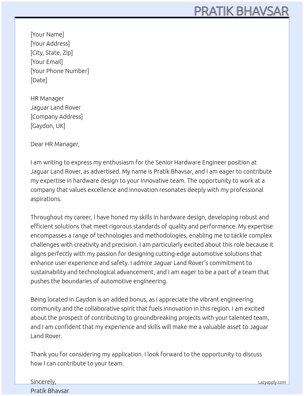 Senior Hardware Engineer Cover Letter At Jaguar Landrover