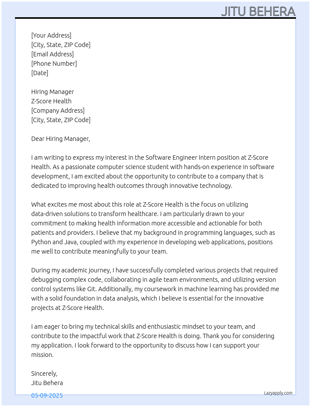 Software EngeZineer Intern Cover Letter At Z-Score Health