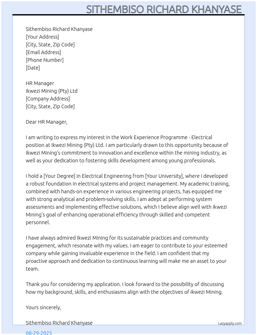 Work Experience Programme - Electrical Cover Letter At Ikwezi Mining (Pty) Ltd