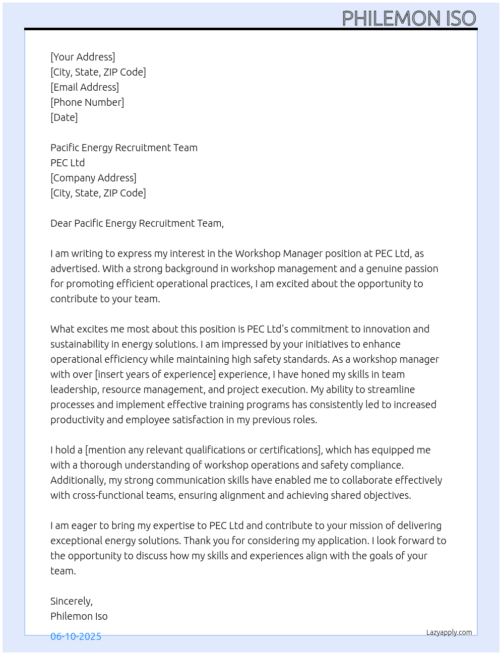 Check out these workshop manager cover letter sample and examples previously used by job seekers to land on job interviews as workshop manager. Use our AI cover letter generator to create a personalized cover letter as workshop manager.