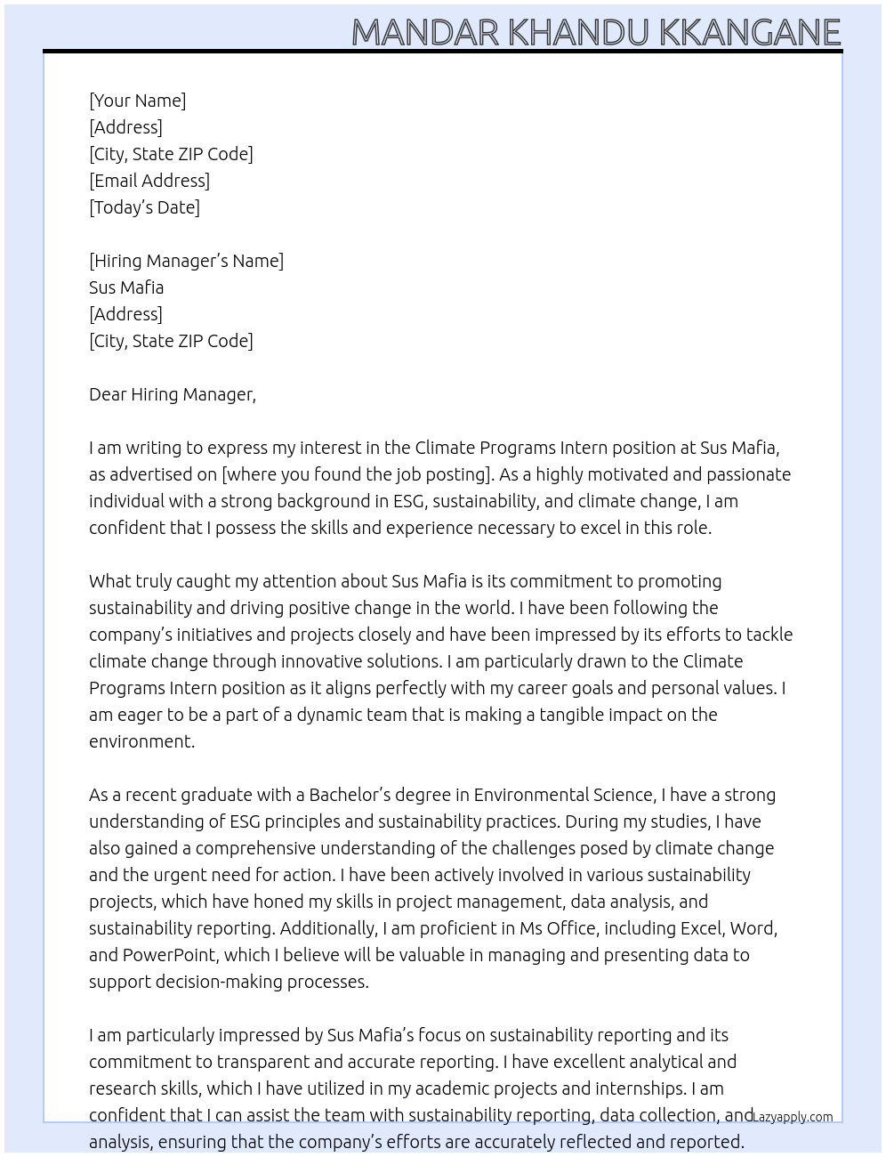 Check out these climate programs intern cover letter sample and examples previously used by job seekers to land on job interviews as climate programs intern. Use our AI cover letter generator to create a personalized cover letter as climate programs intern.