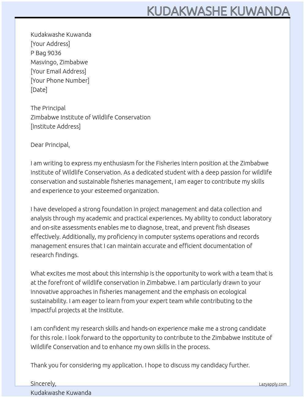 Fisheries Intern Cover Letter At Zimbabwe Institute of Wildlife Conservation