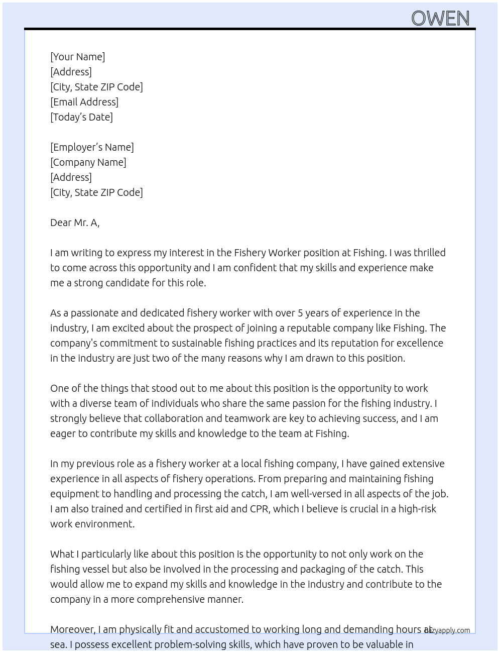 Check out these fishery worker cover letter sample and examples previously used by job seekers to land on job interviews as fishery worker. Use our AI cover letter generator to create a personalized cover letter as fishery worker.