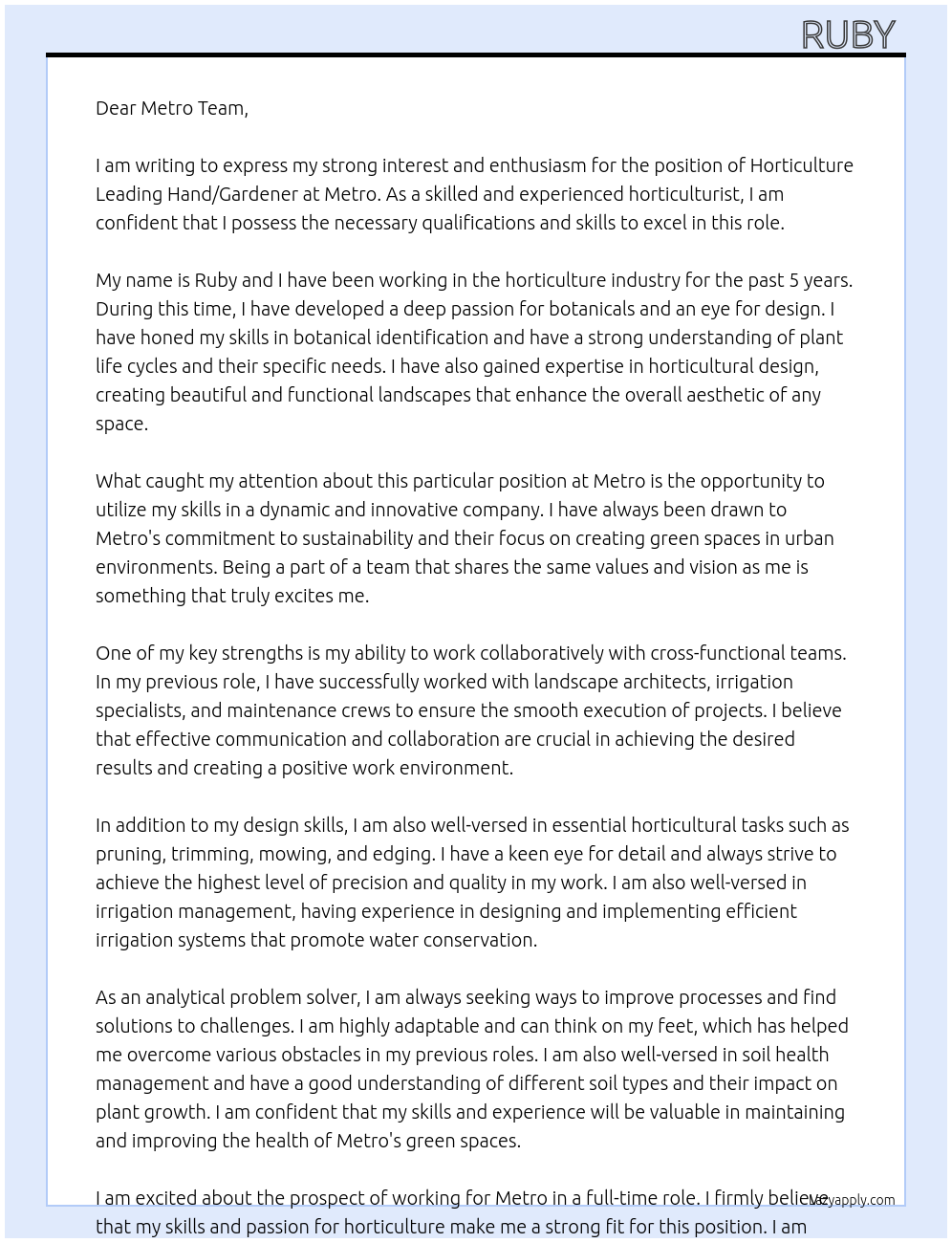 Horticulture Leading Hand / Gardener Cover Letter At Metro