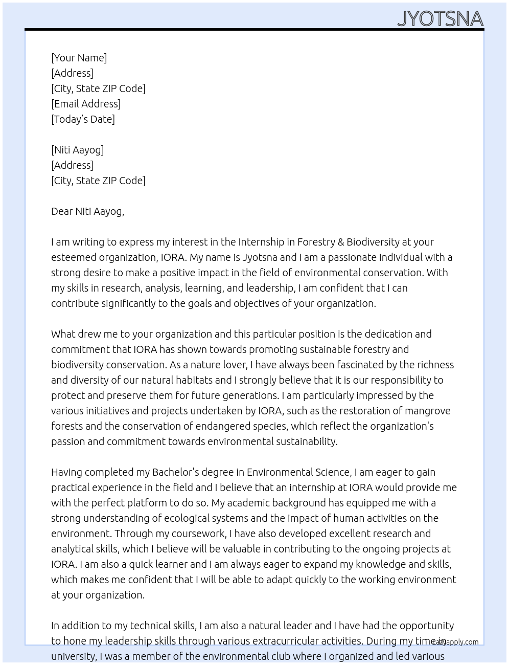 Internship in forestry & biodiversity Cover Letter At IORA