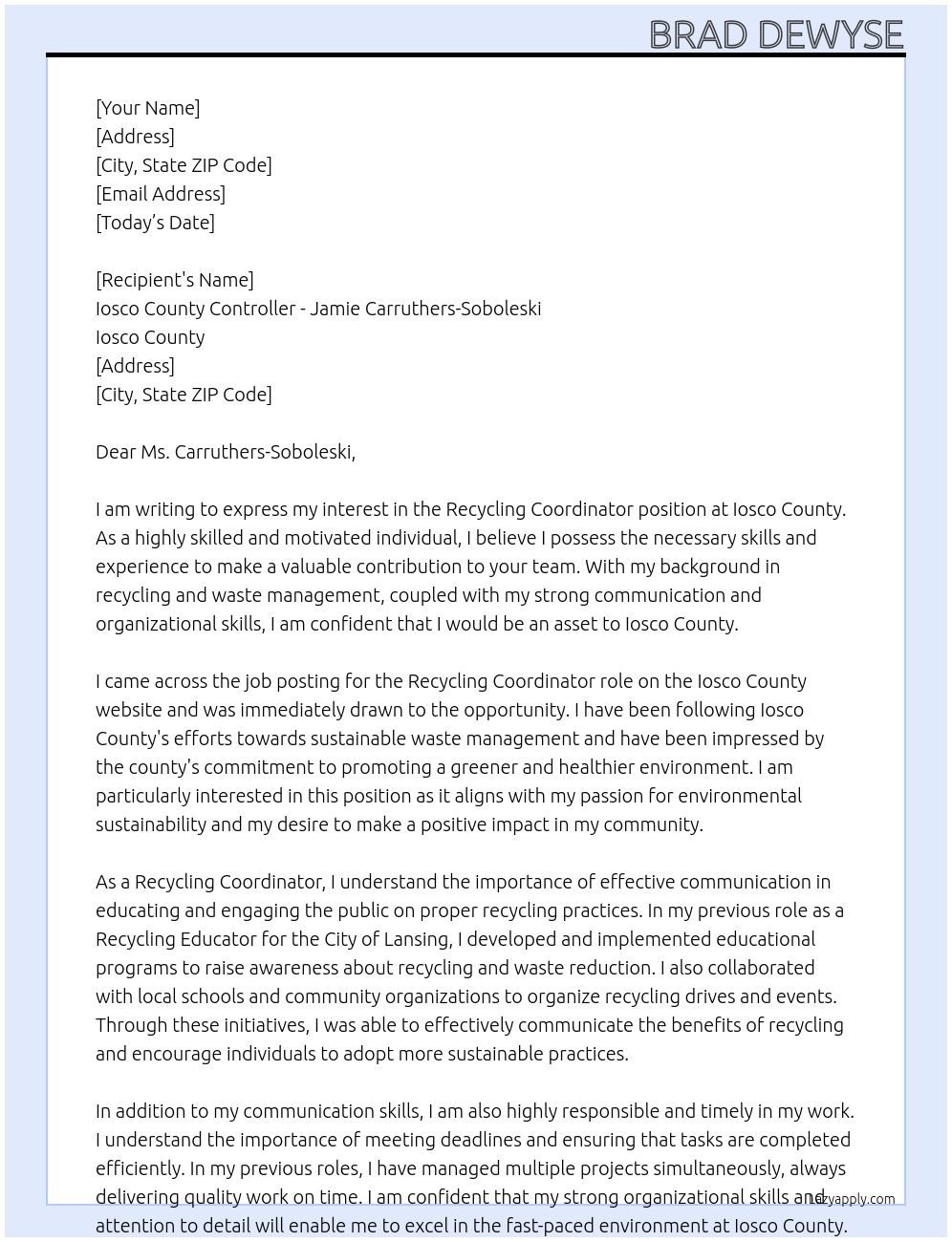 Check out these recycling coordinator cover letter sample and examples previously used by job seekers to land on job interviews as recycling coordinator. Use our AI cover letter generator to create a personalized cover letter as recycling coordinator.