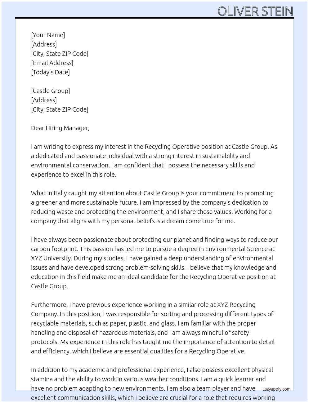 Check out these recycling operative cover letter sample and examples previously used by job seekers to land on job interviews as recycling operative. Use our AI cover letter generator to create a personalized cover letter as recycling operative.