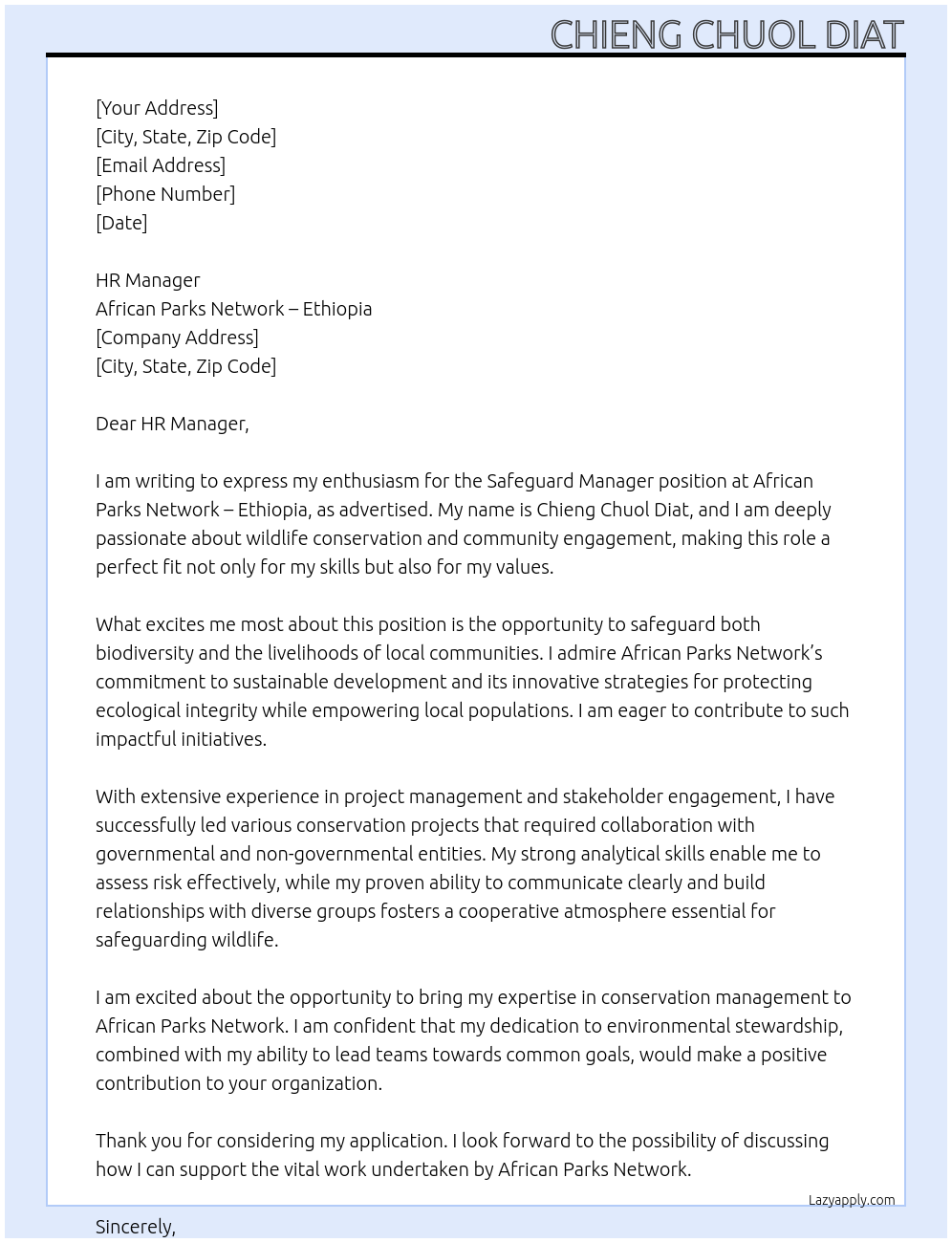 Safeguard Manager Cover Letter At African Parks Network - Ethiopia