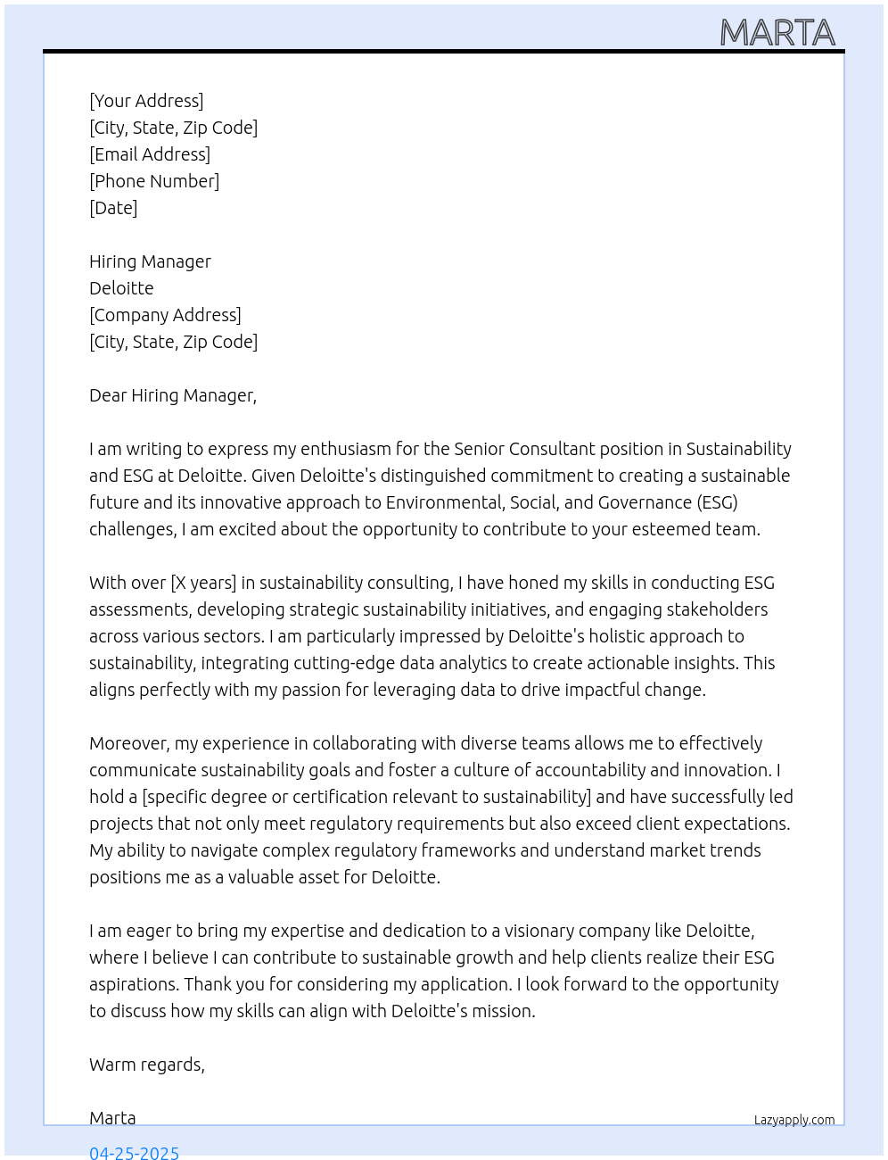 Senior consultant to sustainability and ESG Cover Letter At Deloitte