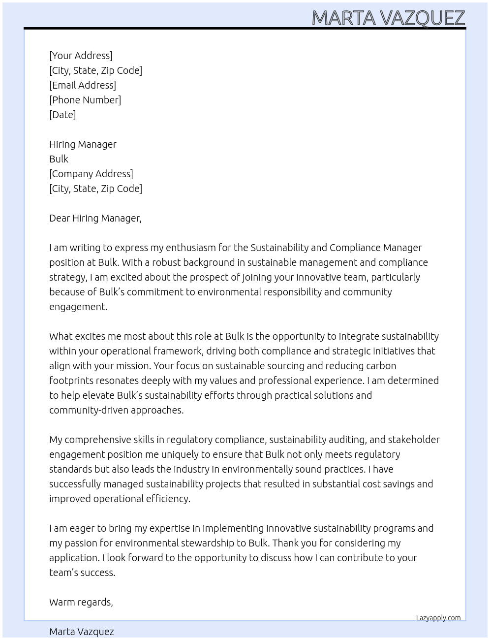 Sustainability And Compliance Manager Cover Letter Examples And Template