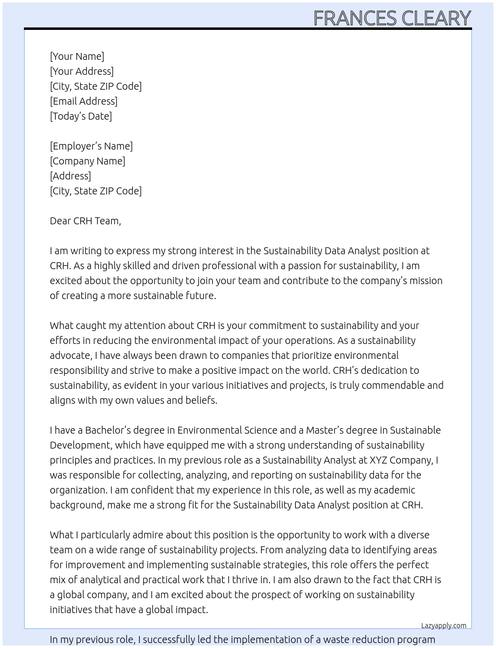 Check out these sustainability data analyst cover letter sample and examples previously used by job seekers to land on job interviews as sustainability data analyst. Use our AI cover letter generator to create a personalized cover letter as sustainability data analyst.
