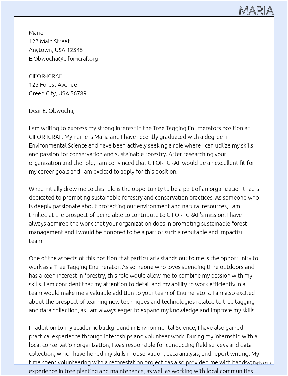 Check out these tree tagging enumerators cover letter sample and examples previously used by job seekers to land on job interviews as tree tagging enumerators. Use our AI cover letter generator to create a personalized cover letter as tree tagging enumerators.