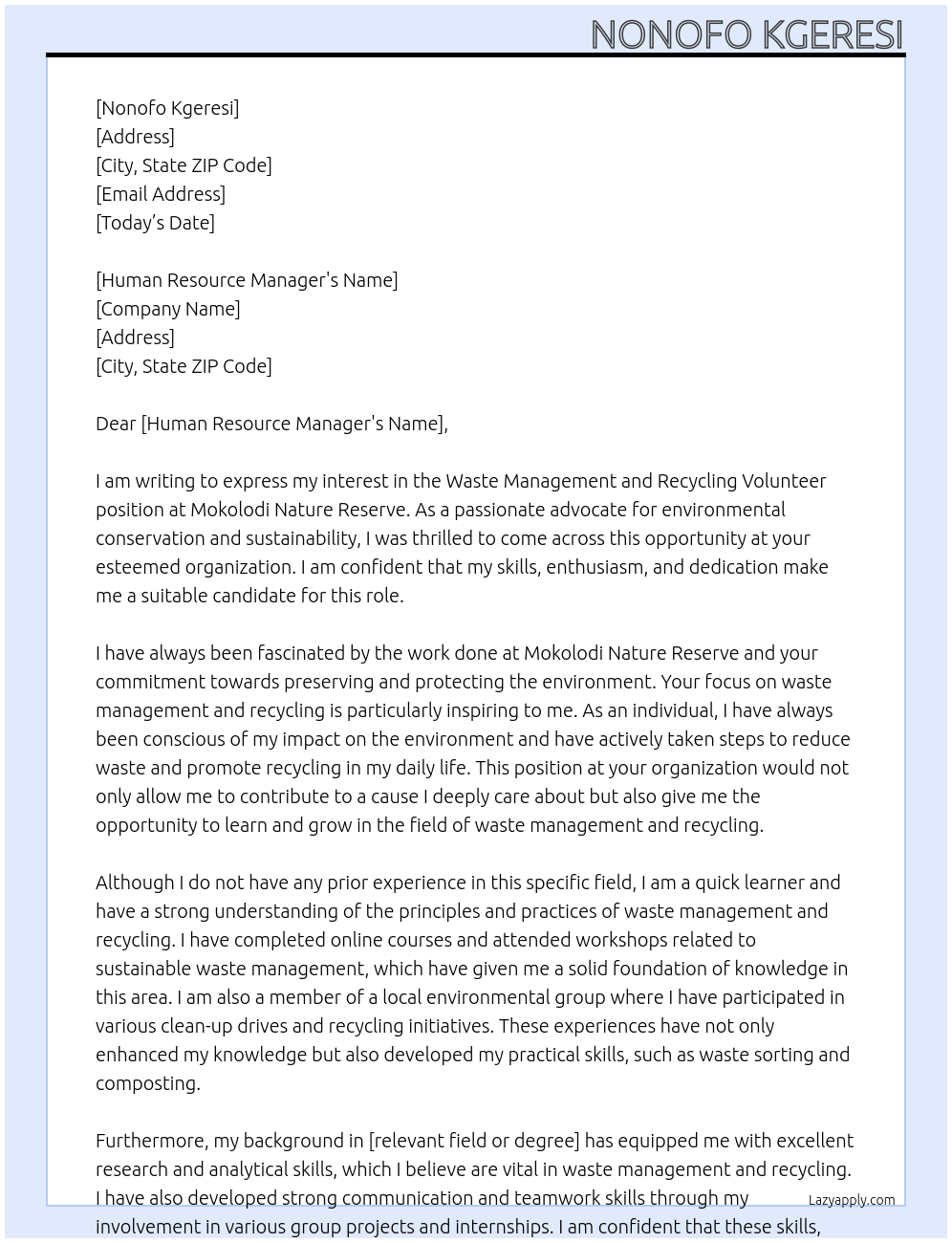 waste management and recycling volunteer with no experience Cover Letter At Mokolodi Nature Reserve