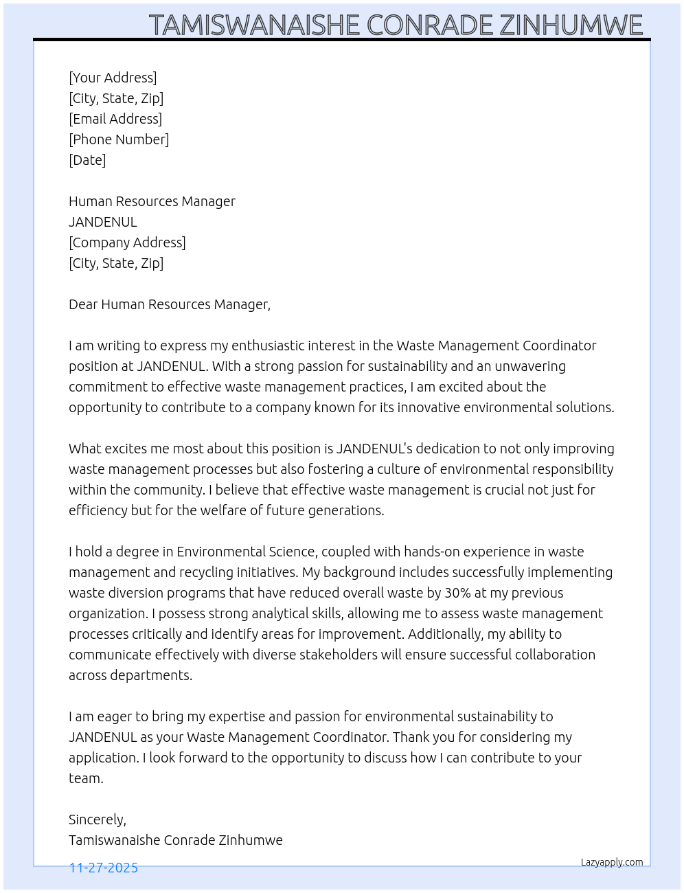 Check out these waste management coordinator cover letter sample and examples previously used by job seekers to land on job interviews as waste management coordinator. Use our AI cover letter generator to create a personalized cover letter as waste management coordinator.