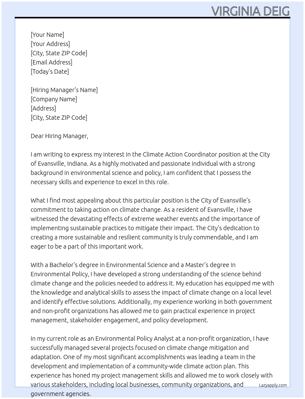 Climate Action Coordinator Cover Letter At City of Evansville, Indiana