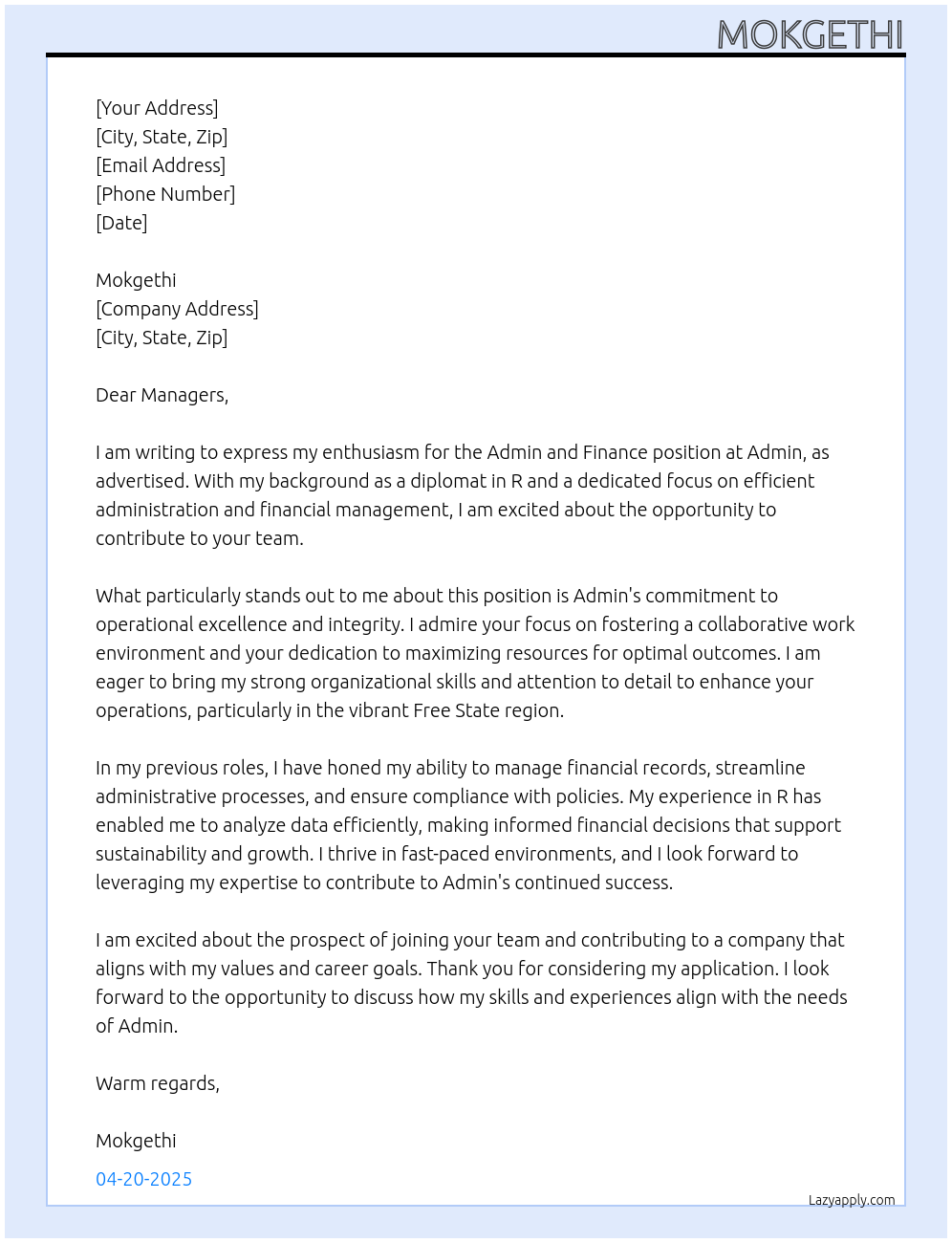 Check out these admin and finance cover letter sample and examples previously used by job seekers to land on job interviews as admin and finance. Use our AI cover letter generator to create a personalized cover letter as admin and finance.