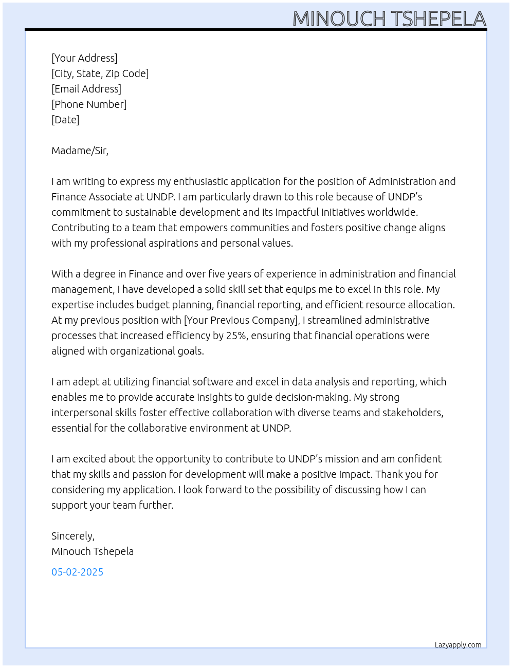 Check out these administration and finance associate cover letter sample and examples previously used by job seekers to land on job interviews as administration and finance associate. Use our AI cover letter generator to create a personalized cover letter as administration and finance associate.