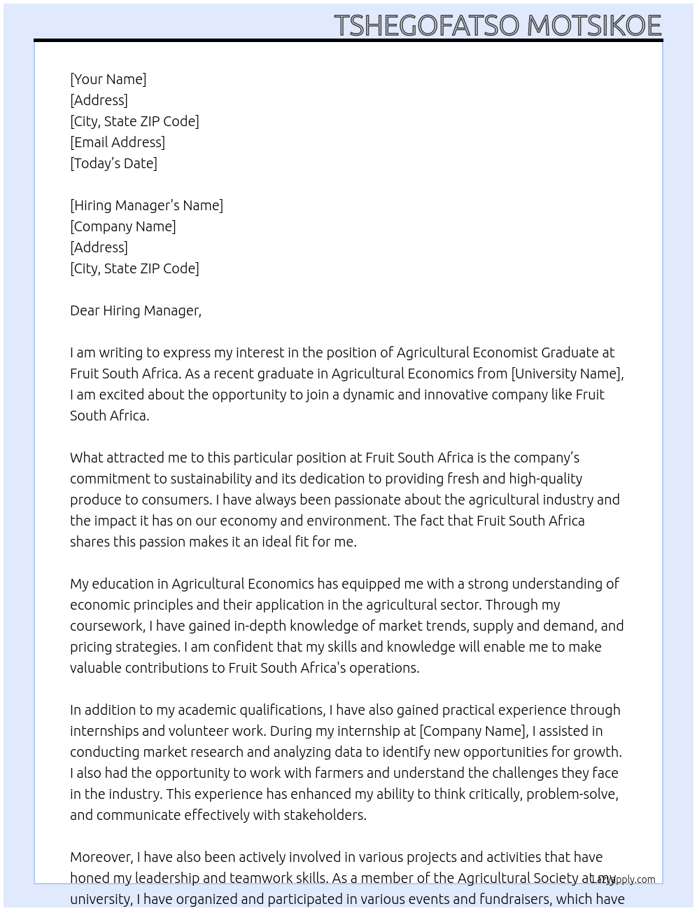Agricultural Economist Graduate Cover Letter At Fruit South Africa
