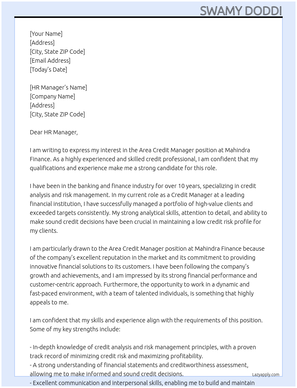 Check out these area credit manager cover letter sample and examples previously used by job seekers to land on job interviews as area credit manager. Use our AI cover letter generator to create a personalized cover letter as area credit manager.
