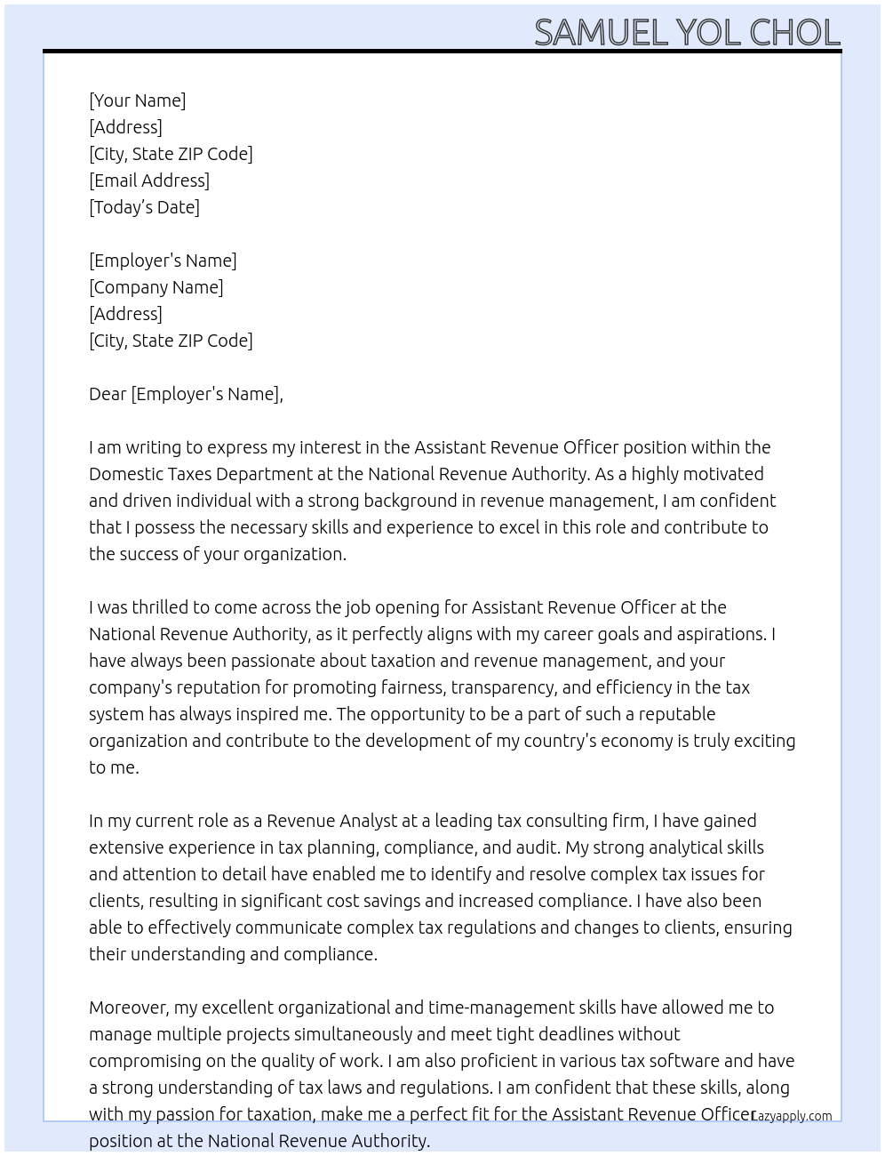Assistant revenue officer Cover Letter At National Revenue Authority