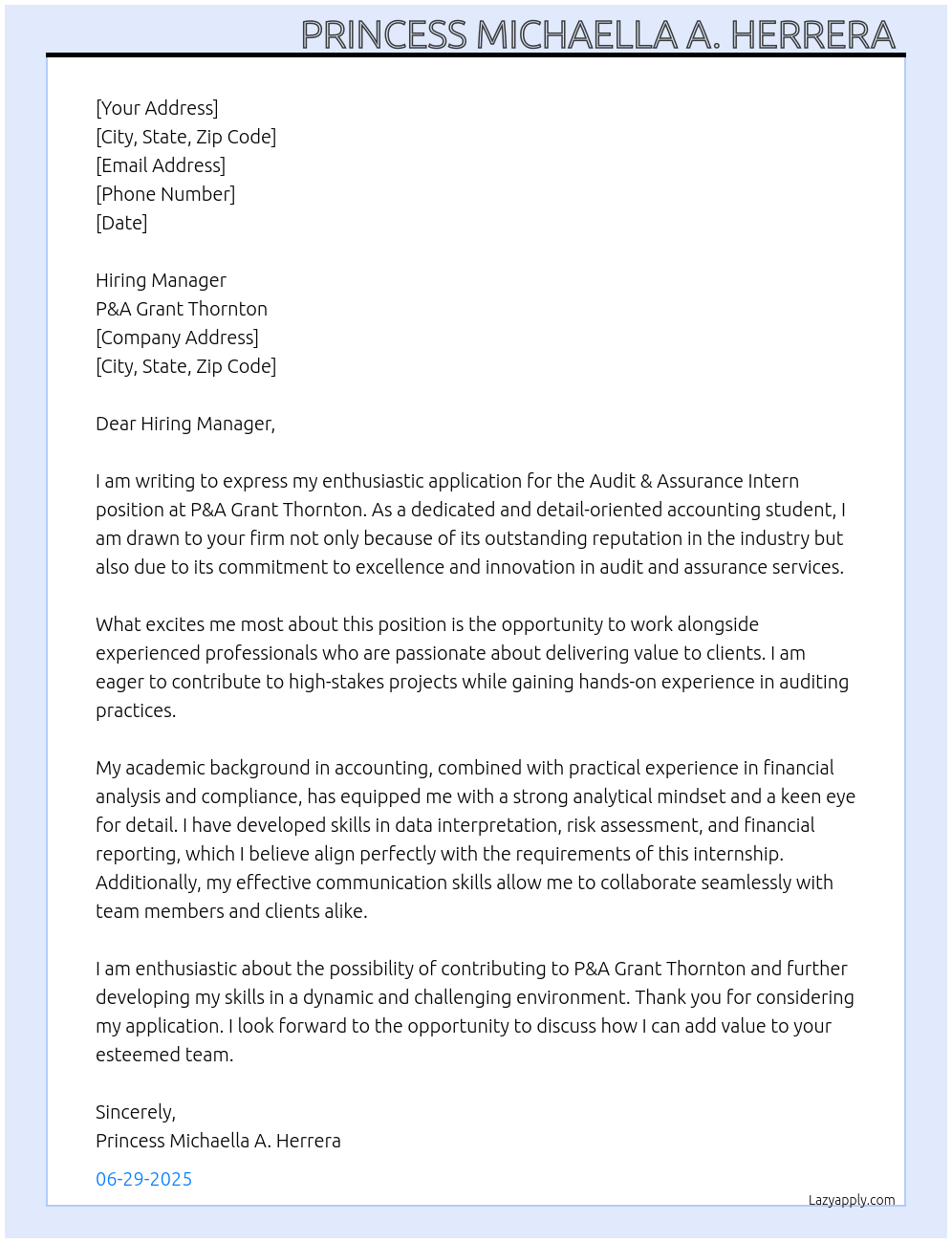 Audit & Assurance Intern Cover Letter At P&A Grant Thornton