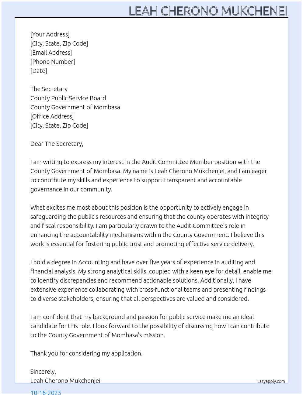 AUDIT COMMITTEE MEMBER Cover Letter At COUNTY GOVERNMENT OF MOMBASA