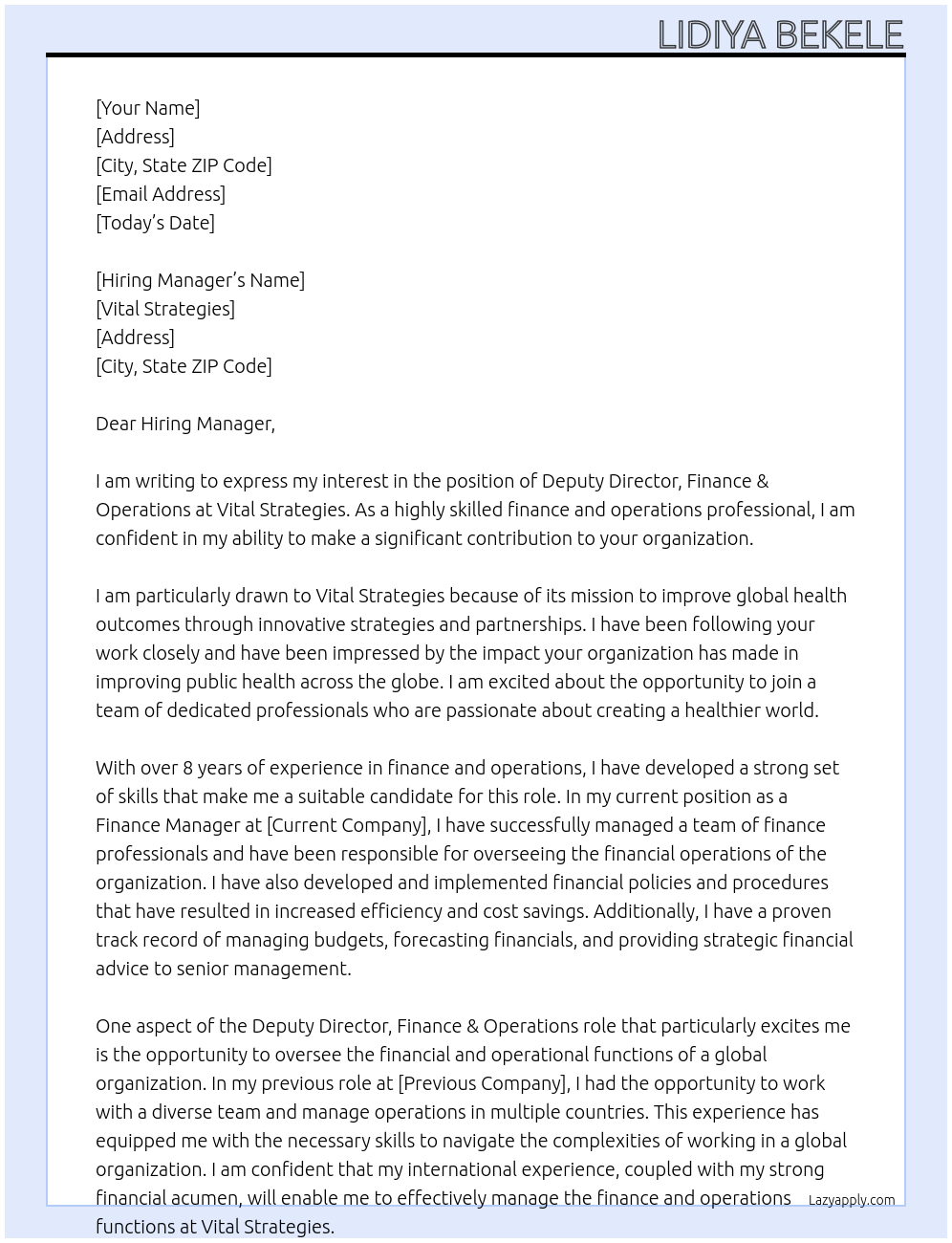 Deputy Director, Finance & Operations Cover Letter At Vital Strategies