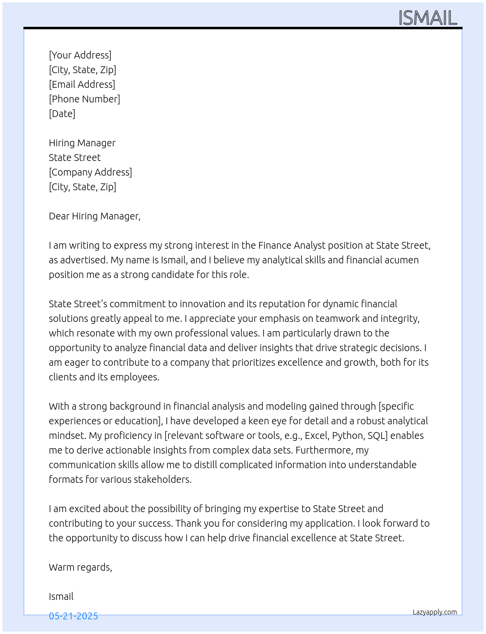 Check out these finance analystt cover letter sample and examples previously used by job seekers to land on job interviews as finance analystt. Use our AI cover letter generator to create a personalized cover letter as finance analystt.