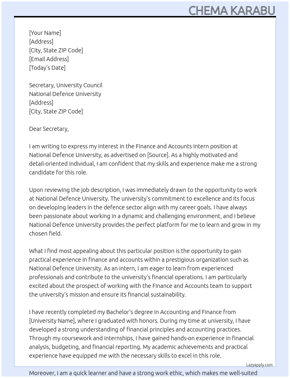 Finance and Accounts Intern Cover Letter At Nuclear power and energy agency