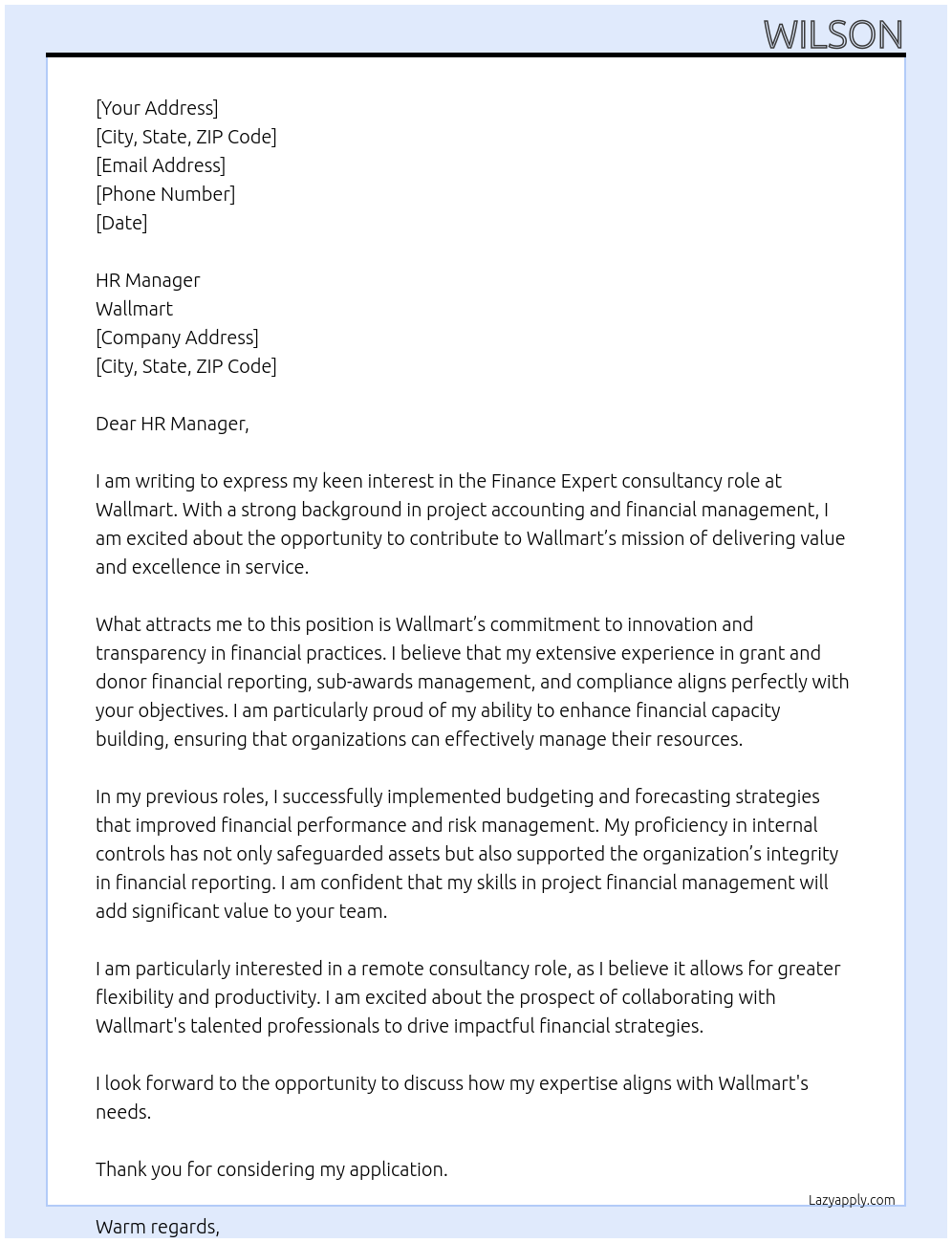 Check out these finance expert cover letter sample and examples previously used by job seekers to land on job interviews as finance expert. Use our AI cover letter generator to create a personalized cover letter as finance expert.