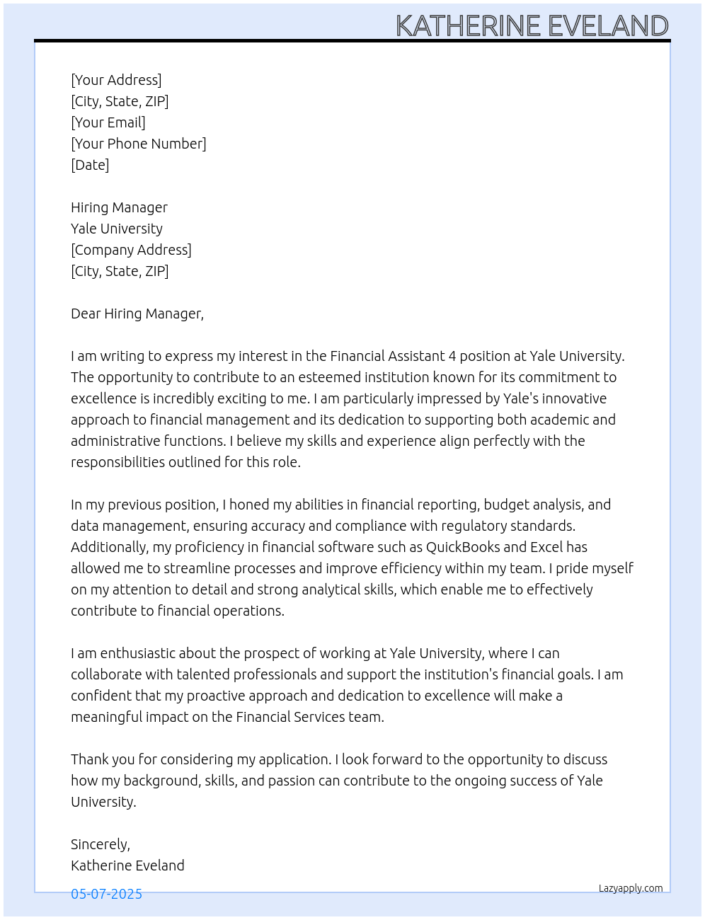 Check out these financial assistant 4 cover letter sample and examples previously used by job seekers to land on job interviews as financial assistant 4. Use our AI cover letter generator to create a personalized cover letter as financial assistant 4.