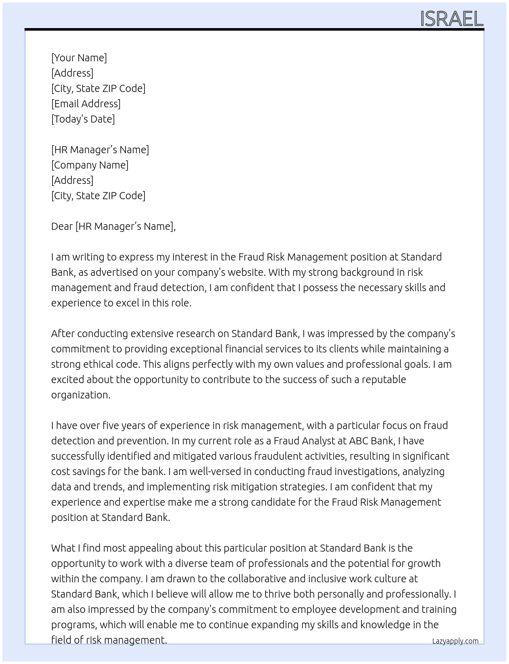 Check out these fraud risk management cover letter sample and examples previously used by job seekers to land on job interviews as fraud risk management. Use our AI cover letter generator to create a personalized cover letter as fraud risk management.