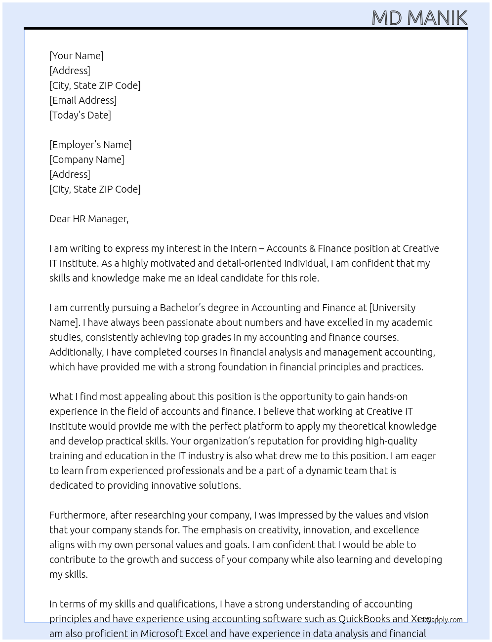 Intern – Accounts & Finance Cover Letter At Cretaive IT Institute