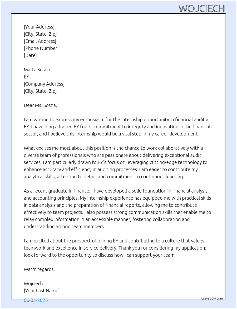 Check out these internship in financial audit cover letter sample and examples previously used by job seekers to land on job interviews as internship in financial audit. Use our AI cover letter generator to create a personalized cover letter as internship in financial audit.