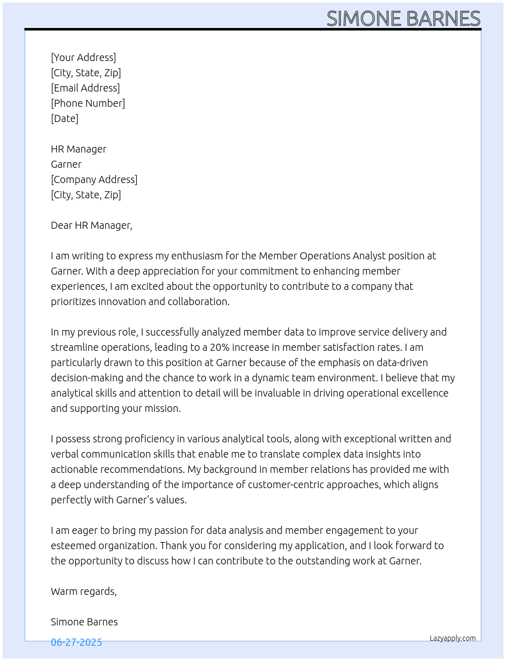 Check out these member operations analyst cover letter sample and examples previously used by job seekers to land on job interviews as member operations analyst. Use our AI cover letter generator to create a personalized cover letter as member operations analyst.
