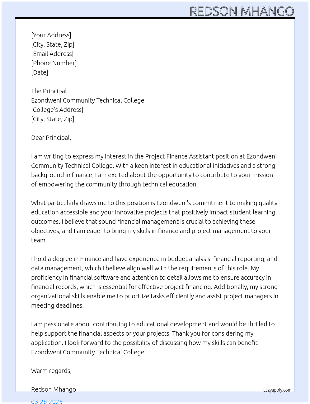 Project Finance Assistant Cover Letter At Ezondweni Community Technical College