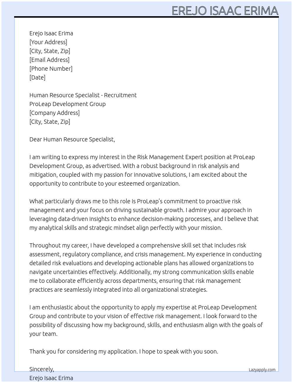Risk Management Expert, Roster Cover Letter At ProLeap development Group